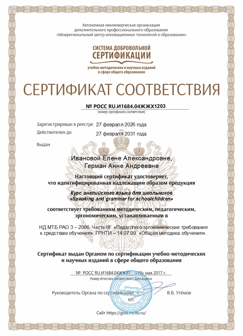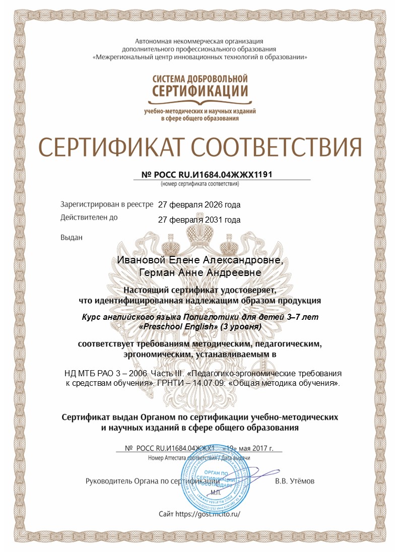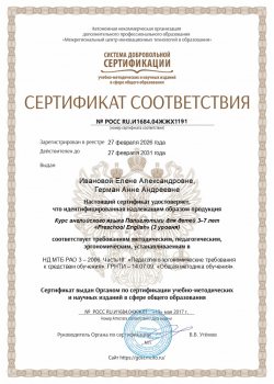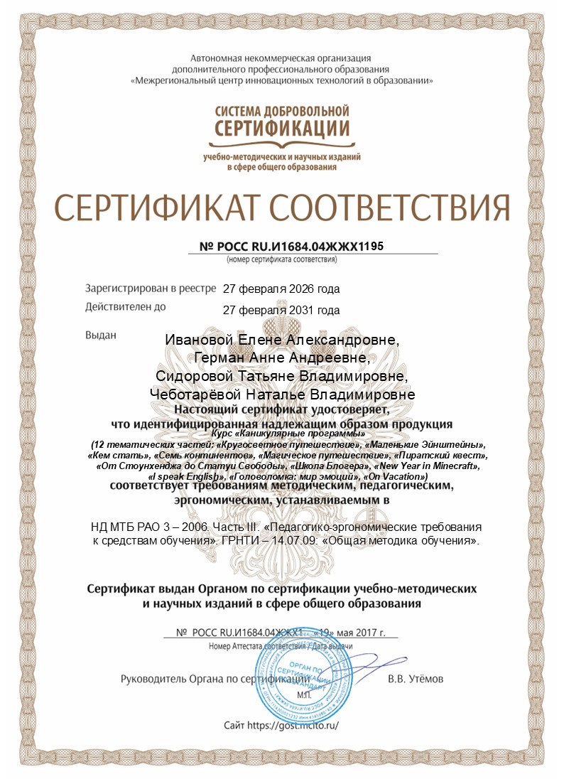 Все наши программы проходят сертификацию соответствия методическим, педагогическим и эргономическим требованиям: